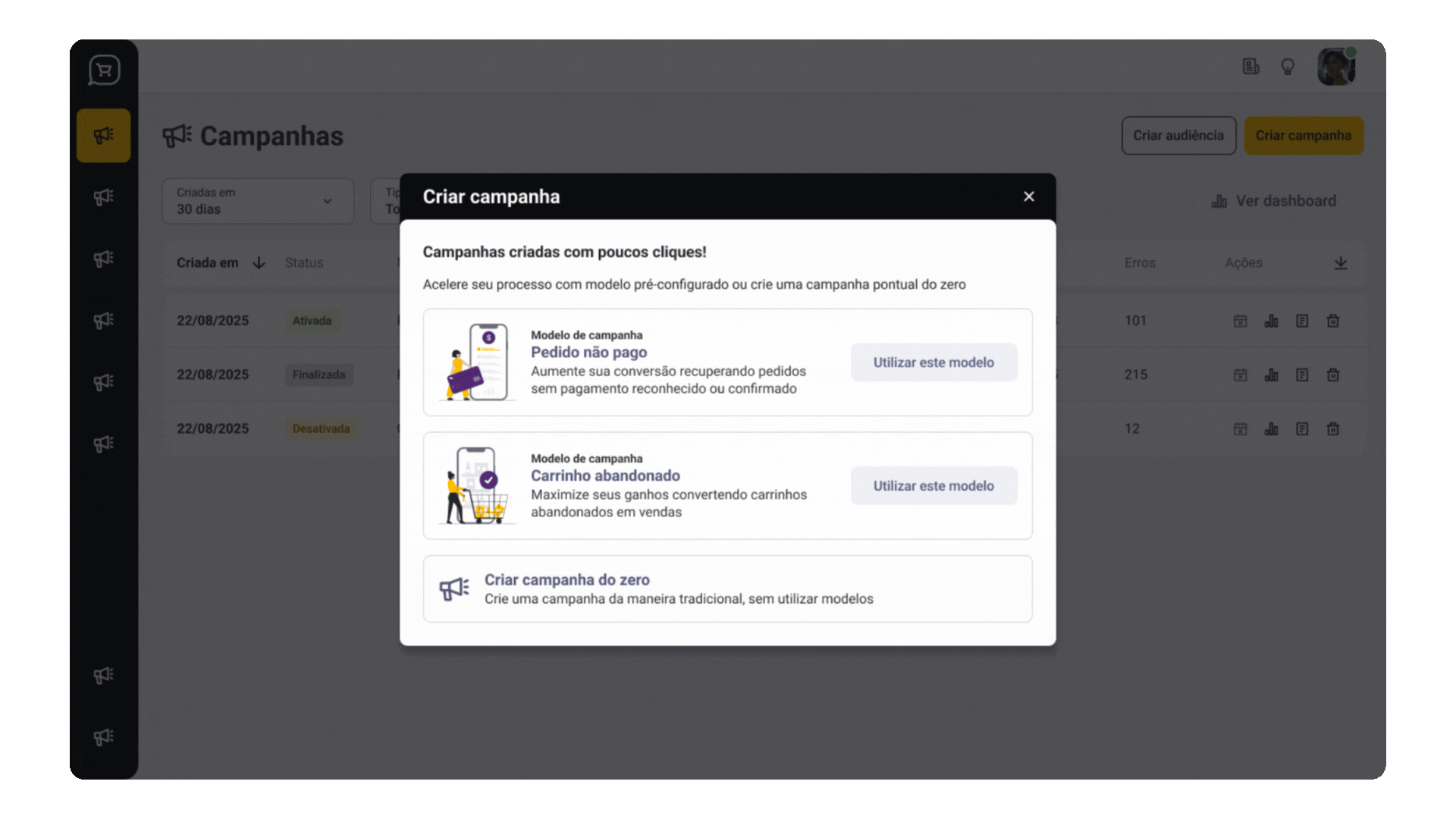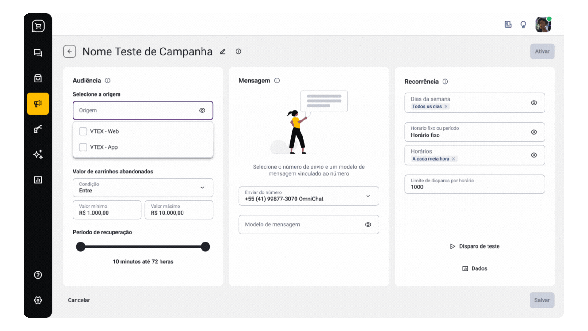 Recupere carrinhos abandonados também no aplicativo do seu e-commerce, com campanhas automatizadas no WhatsApp, reduzindo perdas e maximizando suas chances de vender.
